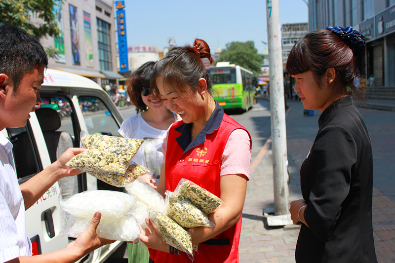 百瑞源枸杞养生馆胜利店员工拿到公司发放的防暑饮品