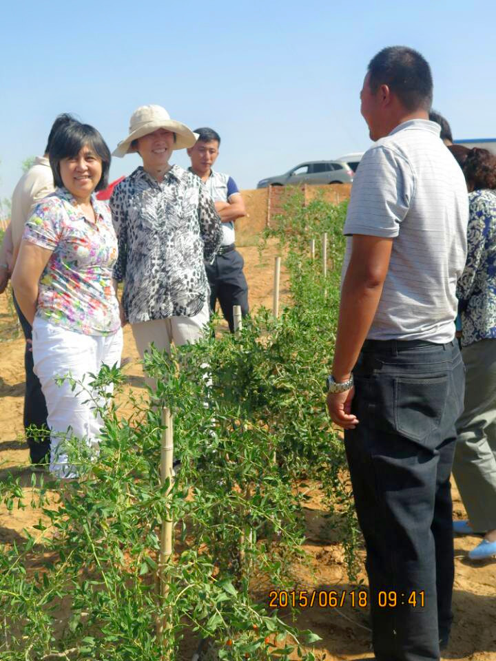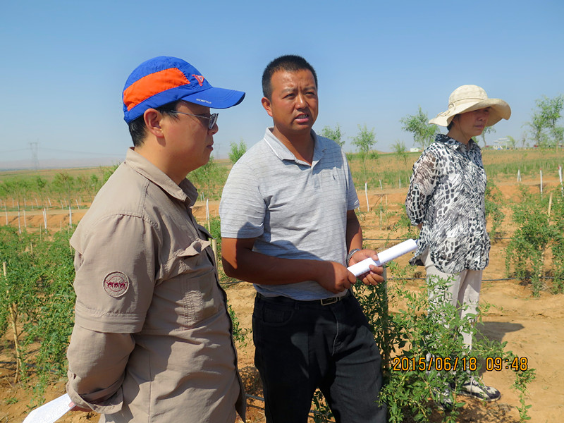 石秋池一行走进百瑞源三大枸杞基地之一吴忠红寺堡原生态6000亩枸杞基地,察看了枸杞的生长情况,基地副总经理马涛向领导及专家一行介绍了枸杞的生长情况以及节水灌溉对枸杞生长的重要意义。
