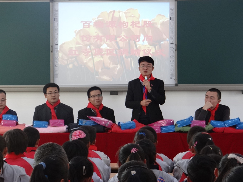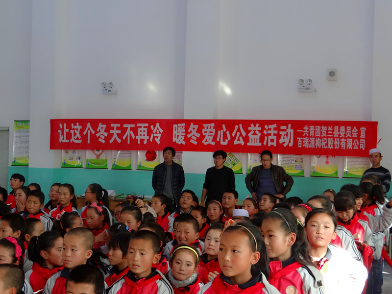 11月13日,百瑞源枸杞股份有限公司(简称百瑞源)工会联合贺兰县团委,来到吴忠市红寺堡区燕宝小学,为学校贫困学生送去24箱棉衣和100盒休闲食品,开启了百瑞源2015年“暖冬行动”的序幕。