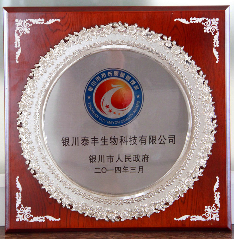 2014年百瑞源(当时名为银川泰丰生物科技有限公司)荣获银川市市长质量管理奖