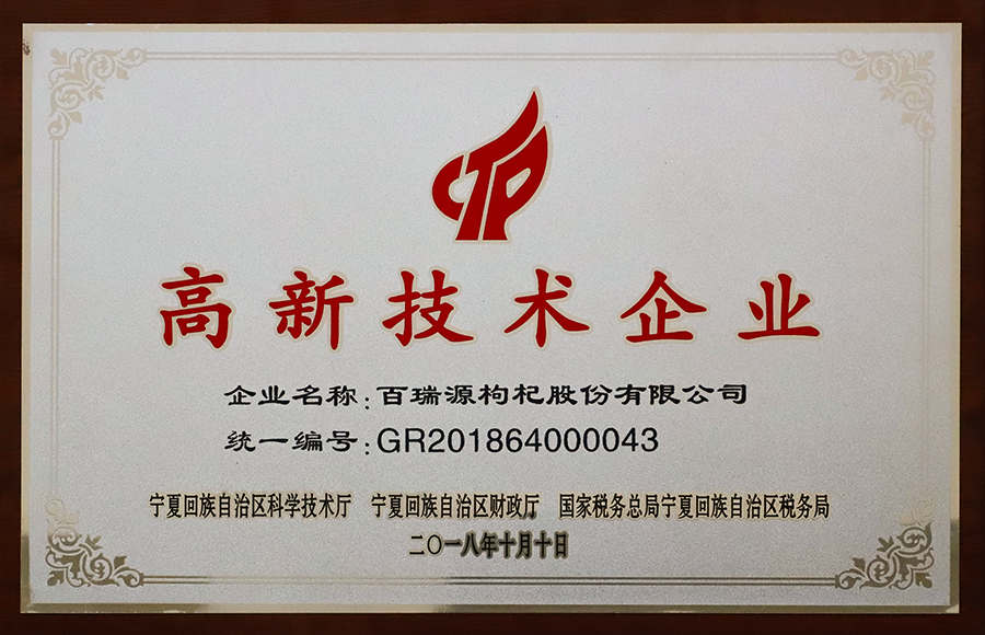 由国家科技部、国家财政部、国家税务总局批准认定的“2018年高新技术企业”名单,于2018年12月29日由全国高新技术企业认定管理工作领导小组办公室正式公布,百瑞源枸杞股份有限公司榜上有名。1月22日下午,宁夏回族自治区科技厅对2018年认定的“国家高新技术企业”举行了隆重的授牌仪式,授予百瑞源为“国家高新技术企业”(证书编号:GR201864000043)旨在表彰百瑞源在中国枸杞行业持续进行研究开发与技术成果转化,并形成企业自主知识产权和核心竞争力,为百瑞源走创新驱动、高质量发展奠定了坚实的基础。
