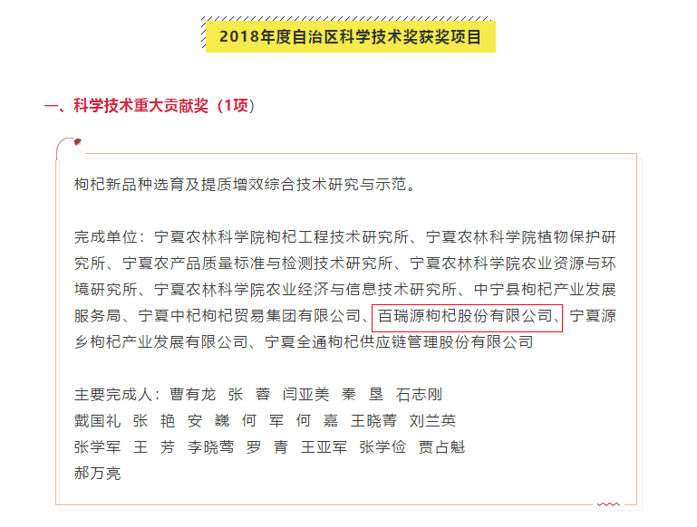 8月16日,自治区人民政府发布了,《关于2018年度自治区科学技术奖励的决定》,公布2018年度宁夏科学技术奖评奖结果,全区共68个项目获奖,其中,科学技术重大贡献奖1项。该奖项由百瑞源等单位参与,自治区农科院枸杞工程技术研究所、枸杞首席专家曹有龙挂帅的《枸杞新品种选育及提质增效综合技术研究与示范》荣获2018宁夏科学技术重大贡献奖。